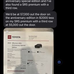 On November 7th, 2022 I went to Brent Brown Toyota where I met with Rylee (she was pleasant and easy to work with) in sales and together we built and ordered a '23 Tacoma to my desired specifications. I was informed that the truck may not be built exactly as requested and that it could take as long as 4-6 months. On February 2nd, 2023 I received notice that the truck had been built and was slated for delivery between February 18th and March 8th. On February 3rd I went in to review and sign the paperwork. Dealing with Josh in finance was the unpleasant part of this ordeal. Upon voicing my displeasure, Nate the finance director, bent over backward to make things right. Initially, I had contemplated not giving any more of my future business to Brent Brown but at this point I have no reason not to.